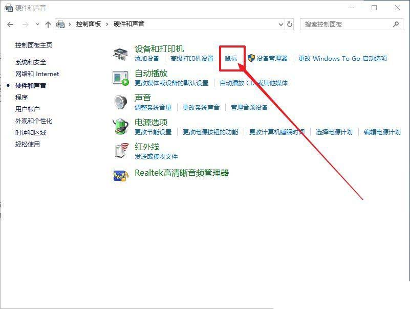 3、路径:控制面板 - 硬件和声音,点击设备和打印机下的鼠标;