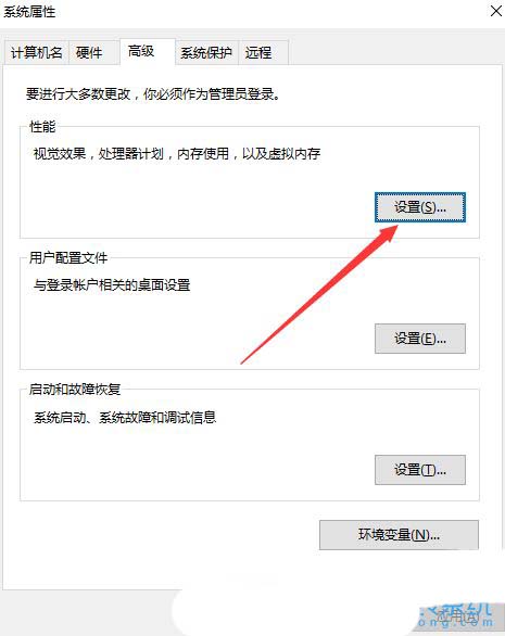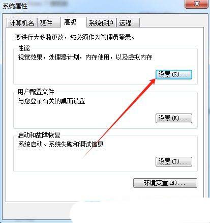 3、点击性能(视觉效果,处理器计划,内存使用,以及虚拟内存)下的【设置】;