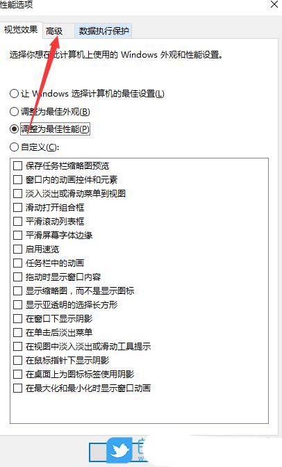 4、性能选项窗口,切换到【高级】选项卡;