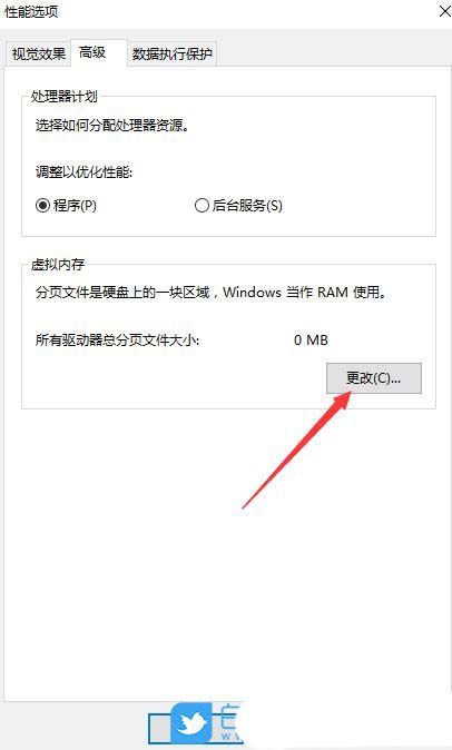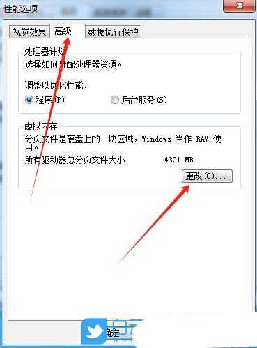 5、性能选项窗口,切换到【高级】选项卡,然后点击虚拟内存下的【更改】;
