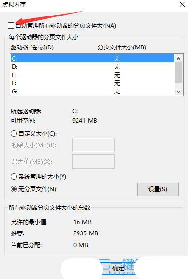 6、虚拟内存窗口,【取消勾选】自动管理所有驱动器的分页文件大小;