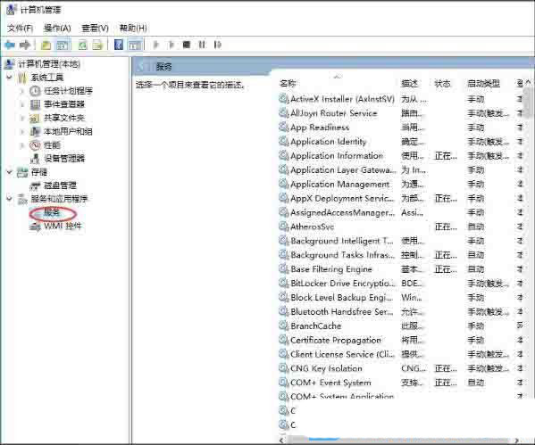 1、还是计算机管理窗口,展开并点击左侧服务和应用程序下的服务;