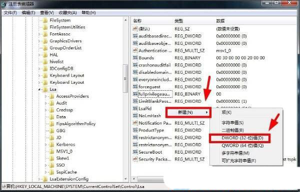 3、左侧点击lsa选项,右侧空白处点击右键,在打开的菜单项中,选择新建 - DWORD(32-位)值;