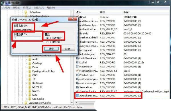 4、数值新建好之后,重命名为AutoShareServer,编辑 DWORD (32 位)值窗口中,将数值数据修改为1,基数选择十六进制,最后点击确定即可;