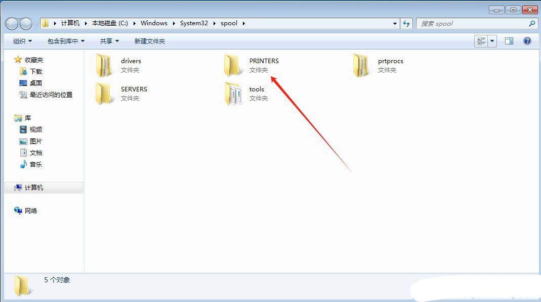 5、此时,将“spool”下的“printers”中所有文件全部删除。