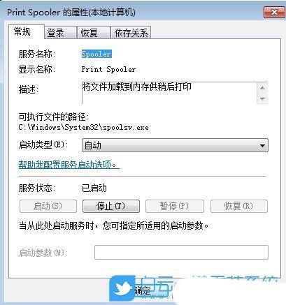 6、最后,返回到“服务”的“print spooler”项,将其恢复启动。把打印机电源断开一分钟后重启电脑即可。
