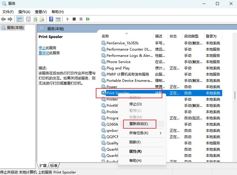 ② 重启服务:按下Win+R键,输入services.msc并回车,在服务列表中找到“PrintSpooler”服务,右键点击并选择“重新启动”。