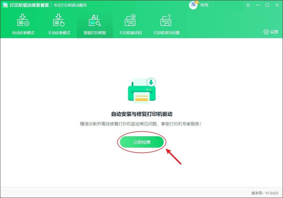 1、打开软件,主界面会清晰地展示核心功能,点击界面上方的“智能打印修复”,点击“立即检测”,软件将立即开始全面扫描打印机设备状态和驱动问题。