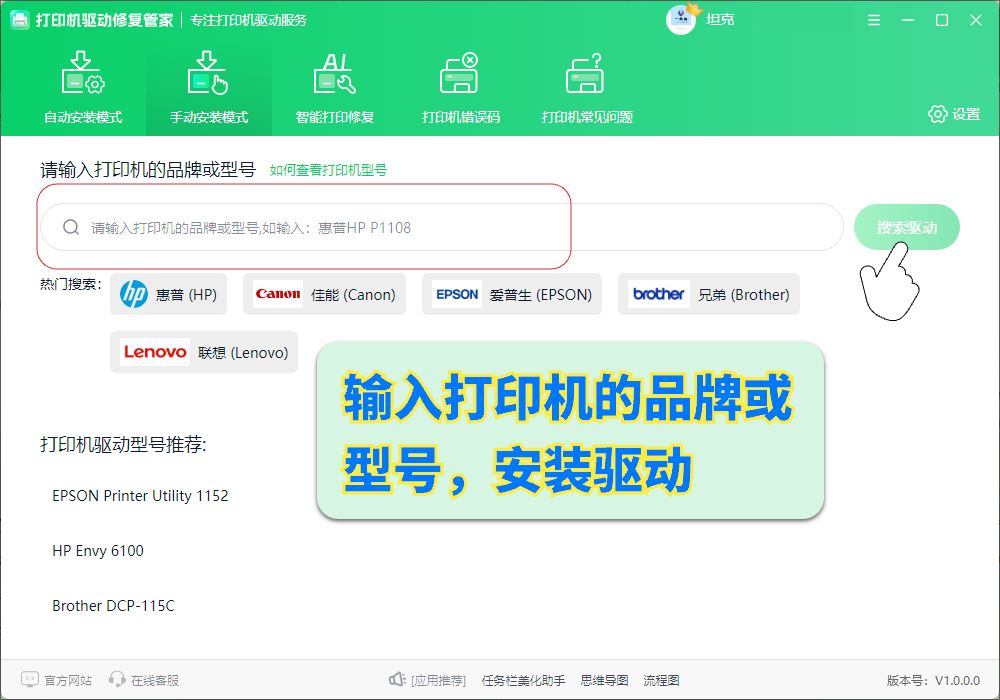 3、此外,它也支持自动或手动安装驱动,例如“手动安装模式”,只需在界面中输入打印机的品牌和型号,就可以轻松搜索出该品牌型号下的驱动,根据自己的电脑系统版本下载合适的驱动进行安装即可,适合对打印机和电脑有一定基础知识的小伙伴。