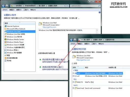 点击“设置默认程序”,我们可以在下图左边的程序列表框中看到当前注册在系统中的默认程序,选中 Windows Live Mail,并单击右边的“选择此程序的默认值”,之后在“设置程序关联”中复选“.eml”类型的扩展名,单击确定完成设置即可。