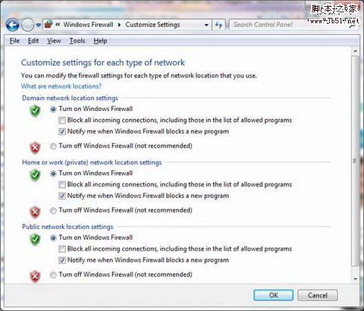 在全部的网络模式中,Windows 7 firewall都将在默认情况下拦截任何发送到不属于白名单中应用程序的连接。如图2所示,Windows 7允许你对不同网络类型分别配置。