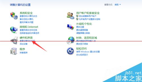 2、进入控制面板选项,找到【硬件和声音】点击进入