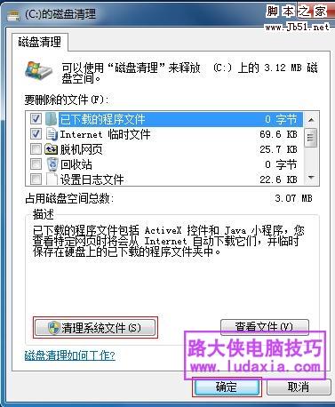 2. 点击“磁盘清理”,会为您列出此盘下的文件类型,勾选您要删除的文件,点击“确定”按钮或“清理系统文件”按钮,系统就会自动为您清理磁盘。