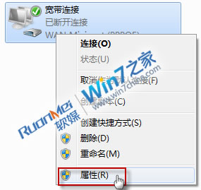 5.接着,在 ADSL 宽带连接图标上,右键鼠标,选择“属性”