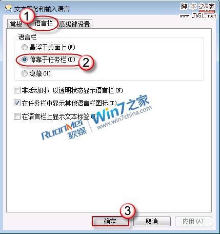2、打开“语言栏”选项卡,点击选中“停靠于任务栏”后按“确定”退出。