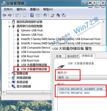 第三步:还需要复制“通用串行总线控制器”中“USB大容量存储设备”的硬件ID,在“设备管理器”中展开“通用串行总线控制器”列表,找到“USB大容量存储设备”,在它的“属性”窗口中点击“详细信息”标签,复制出它的硬件ID也保存一下。