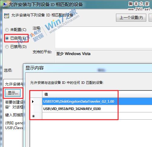 注:只有在(1)设置为“已启用”的前提下,(2)的设置才会生效,这样就可以来禁止策略没描述的USB设备。