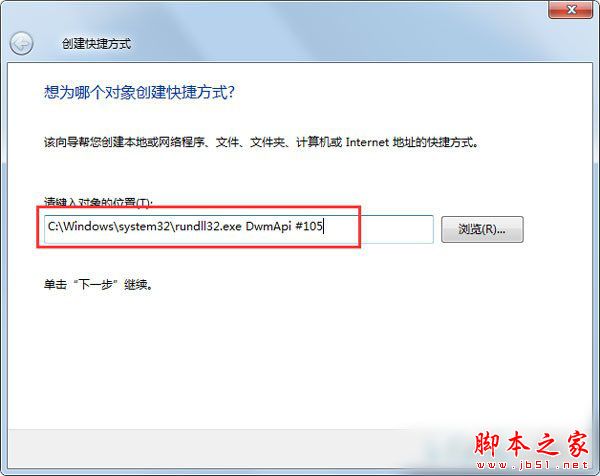 2.打开快捷方式对话框,输入如下的地址,然后点击下一步C:\Windows\system32\rundll32.exe DwmApi #105。