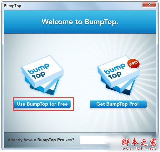 1.启动该软件的时候,弹出一个这样的对话框,women点击如图所示的按钮【use bumptop for free】,免费使用。