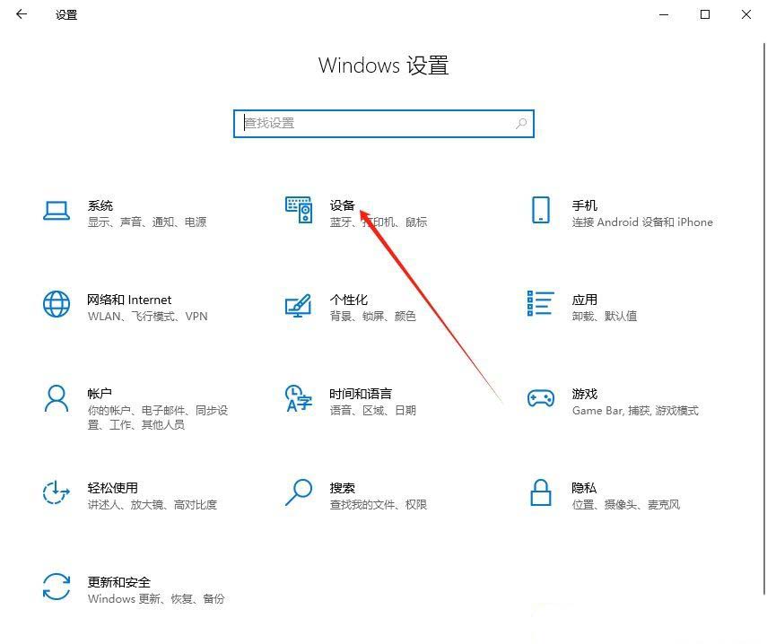 1、首先,按下“Win+I”键打开设置界面,点击进入到“设备”设置。