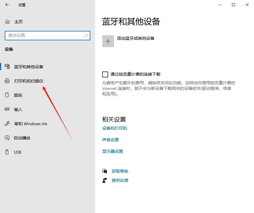 2、接着,在打开的界面中,点击左侧的“打印机和扫描仪”选项。