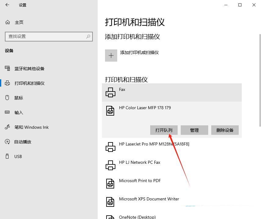 3、然后,在对应的右侧界面中,找到正在使用的打印机,并选择“打开队列”选项。