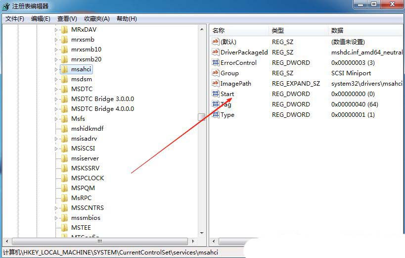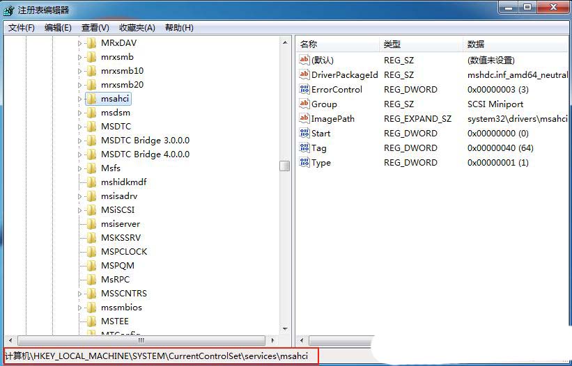 2、接着,依次点击打开“计算机HKEY_LOCAL_MACHINESYSTEMCurrentControlSetservicesmsahci”。