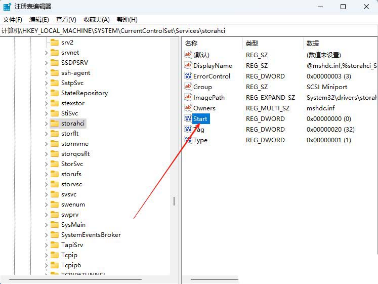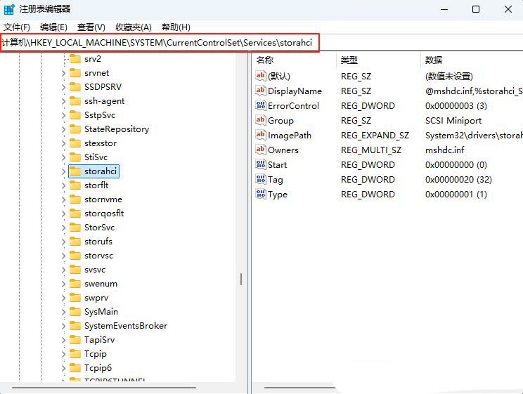 2、接着,依次点击展开“计算机HKEY_LOCAL_MACHINESYSTEMCurrentControlSetservicesstorAHCI”。