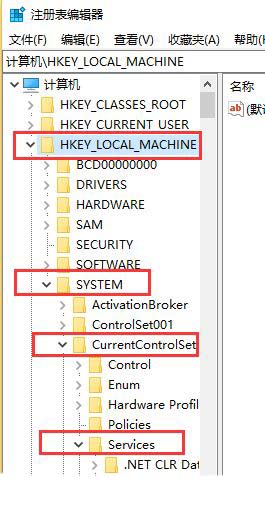 3、注册表编辑器,依次展开到以下路径:HKEY_LOCAL_MACHINESYSTEMCurrentControlSetServices