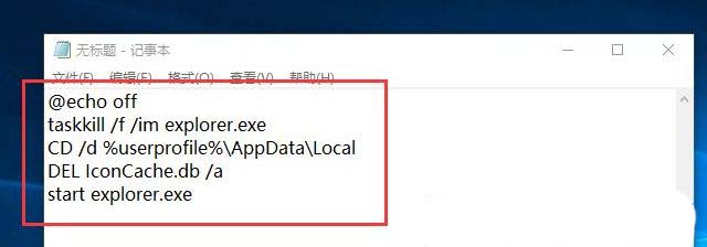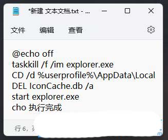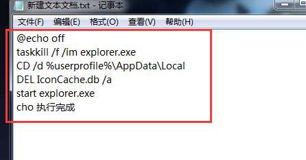 @echo off taskkill /f /im explorer.exe CD /d %userprofile%AppDataLocal DEL IconCache.db /a start explorer.exe cho 执行完成