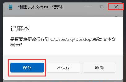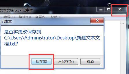 3、内容输入完成后,点击新建文本文档右上角的关闭,然后在弹出的窗口中,点击保存;