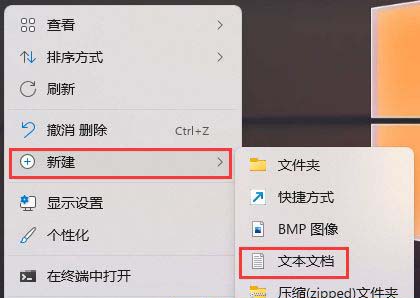 1、右键点击桌面空白处,在打开的菜单项中,选择新建文本文档;