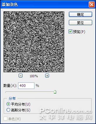 2、切换到"通道"调板,新建一个通道得到"Alpha 1",按D键将前景色和背景色恢复为默认的黑白色,选择"滤镜"|"杂色"|"添加杂色"命令,并设置其对话框如图2所示,单击"确定"命令按钮退出对话框,得到如图3所示。