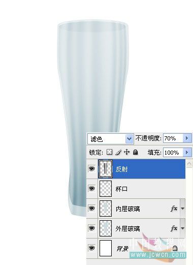 16、按住Ctrl键点击外层玻璃图层,载入选区,选择反射图层,按住Shift+Ctrl+I反选,Delete删除,取消选区,设置不透明度70%,混合模式改为滤色。