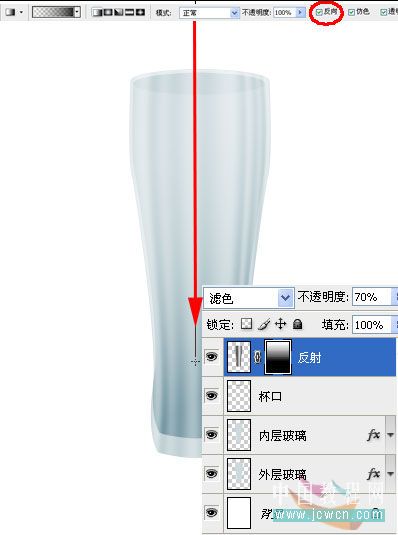 15、设置反射图层不透明度50%,执行编辑——变换——变形,调整至如图效果,按两次回车键确认注意:变形的形状要比杯子稍大。