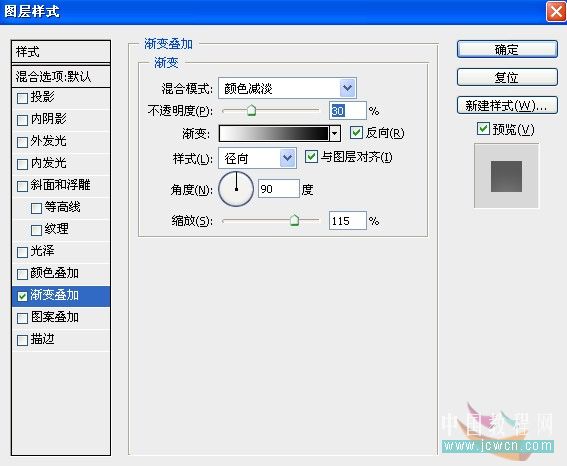 31、杯子和澄汁部分基本完成了,现在请先保存你的文件吧15.1、现在我们来制作泡沫笔刷,新建一个300*300,300dpi的新文件,新建一层,命名:“泡沫”,填充白色,并为泡沫层添加图层样式,选择渐变叠加,设置如图。