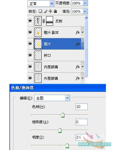 24、复制橙汁层,系统自动命名“橙汁副本”,回到橙汁层,执行编辑——变换——水平翻转,Ctrl+U执行色相饱和度,设置如图。