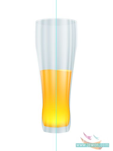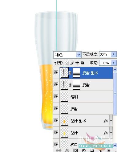 #p# 21、按Ctrl+回车键将路径载入选区,新建一层,命名“橙汁”,填充颜色:#ffb411,将橙汁图层拖到反射图层下面,取消选区。