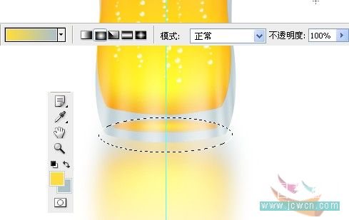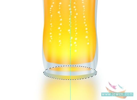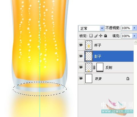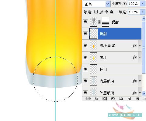 #p# 25、在反射层下方新建一个图层,命名“折射”,选择椭圆选框工具,在杯子的底部画一个圆形。