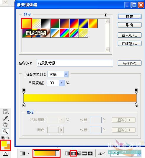 27、设置前景色为:#fff200,背景色为:#f7941d,选择渐变填充工具,前景到背景的渐变,径向。