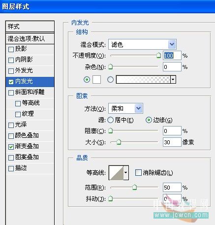 33、继续为泡沫层设置图层样式,选择内发光,设置如图。