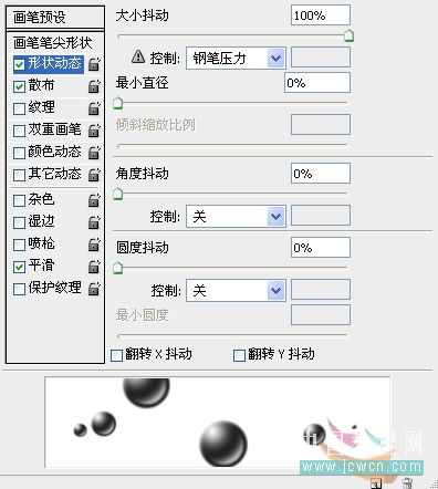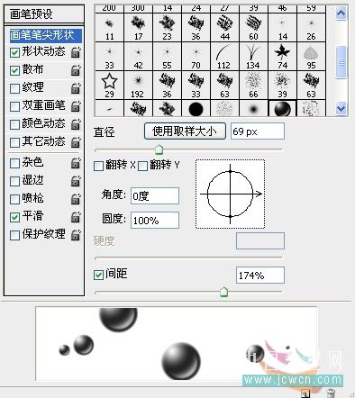 #p# 37、回到橙汁饮料文件,选择刚才制作的泡沫笔刷,按F5调出笔刷预设面板,设置画笔笔尖形状。