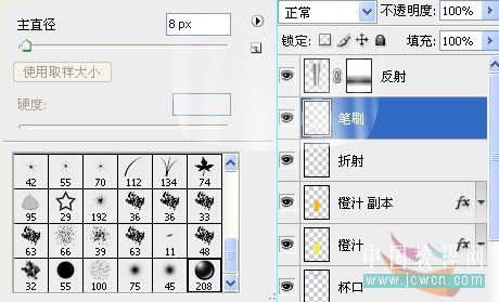 38、在反射图层下面新建一层,命名:“笔刷”,设置前景色为白色,画笔直径8px。