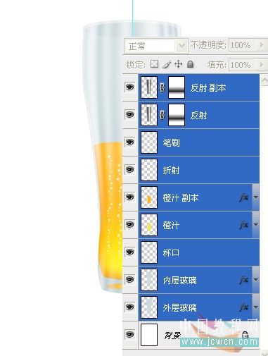 22、选中橙汁层,按住Ctrl键点击内层玻璃图层得到选区,按住Shift+Ctrl+I反选,Delete删除,取消选区。