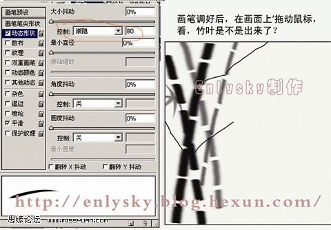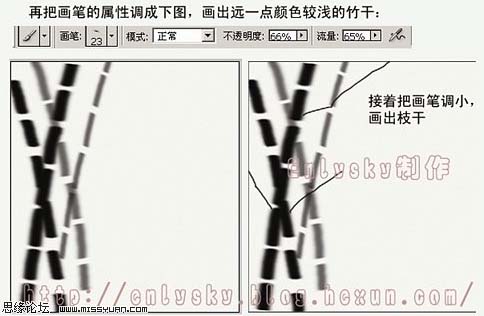 #p# 3、再把画笔的属性调成下爱徒,画出远一点颜色较浅的竹竿。