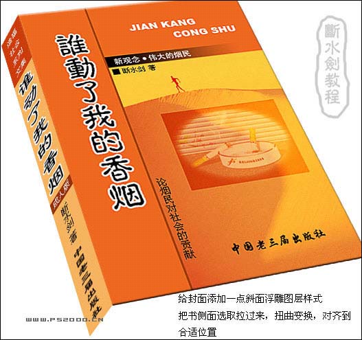 2、给封面添加一点斜面浮雕图层样式,把书侧面选取拉过来,扭曲变换,对齐到合适的位置。