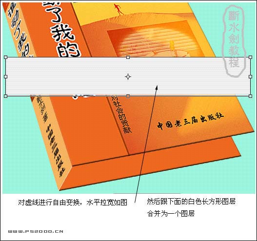 #p# 6、对虚线进行自由变化,水平拉宽如下图,然后跟下面的白色长方形图层合并为一个图层。