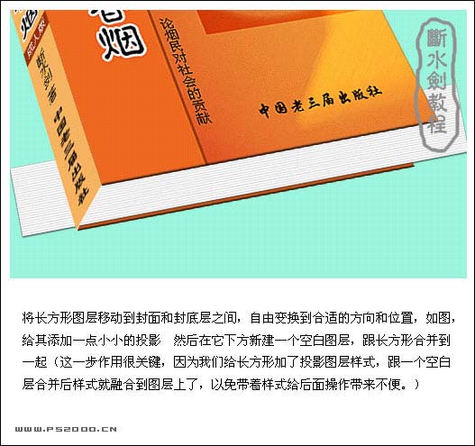 7、将长方形图层移到封面和封底层之间,自由变换到合适的方向和位置,如下图,给添加一点小小的投影,然后在它下方新建一个图层,跟长方形合并到一起。