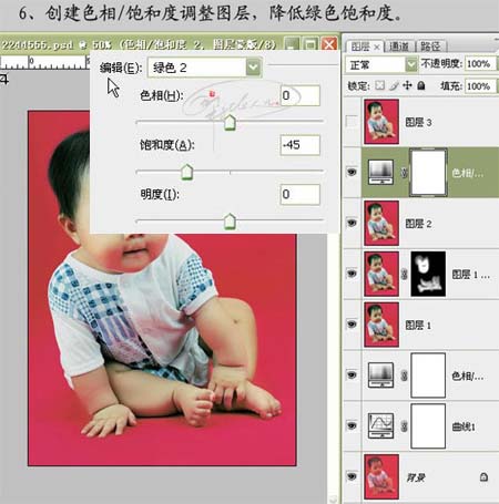 #p# 6、创建色相/饱和度调整图层,降低绿色饱和度,参数设置如下图。
