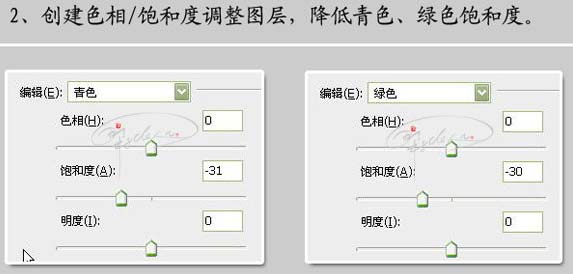 #p# 2、创建色相/饱和度调整图层,减低青色及滤色饱和度,参数及效果如下图。